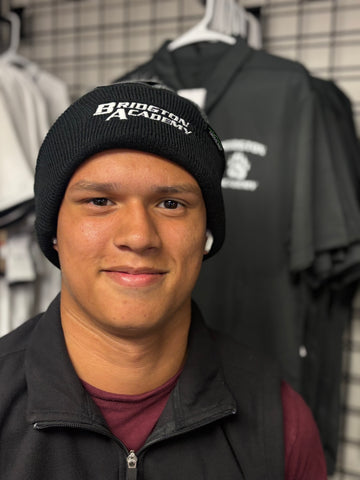 Stay warm and cozy with this classic black and gray pom-style school spirit beanie. One size fits all-- embroidered with the action Bridgton Academy text!